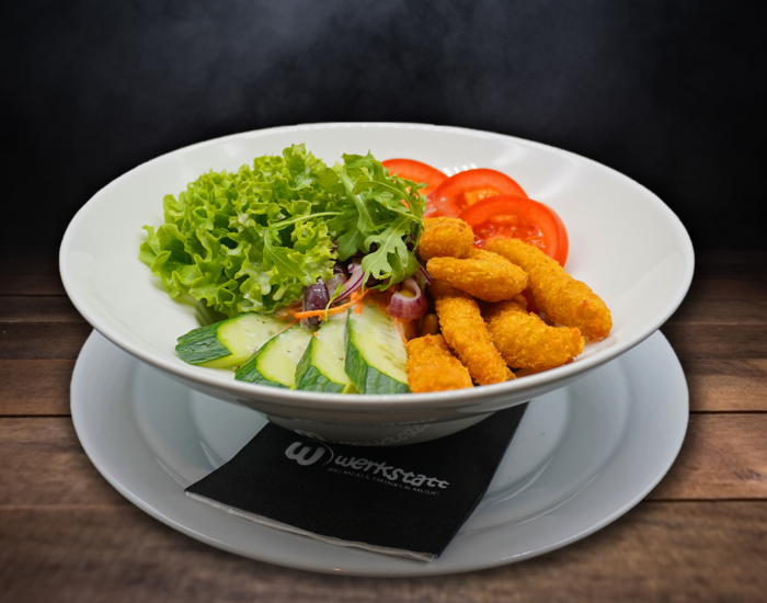 gebackene Hühnerfilets auf gemischtem Salat an Joghurtdressing