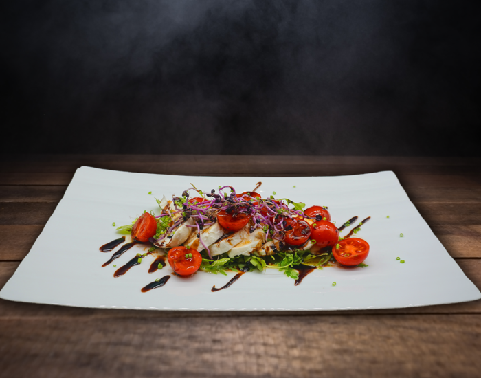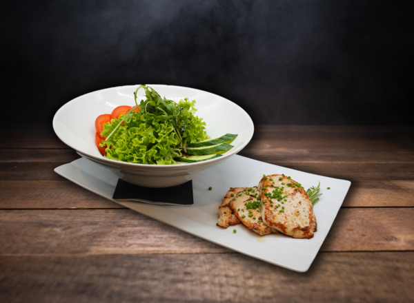 gegrilltes Hühnerbrüstchen auf knackigen Blattsalaten mit Joghurtdressing und Kernöl