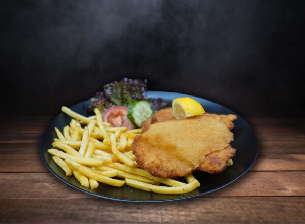 Medaillons vom Schwein, Huhn und Rind mit Pommes frites, gebackenen Zwiebelringen, Speck, Kräuterbutter und verschiedenen Dips